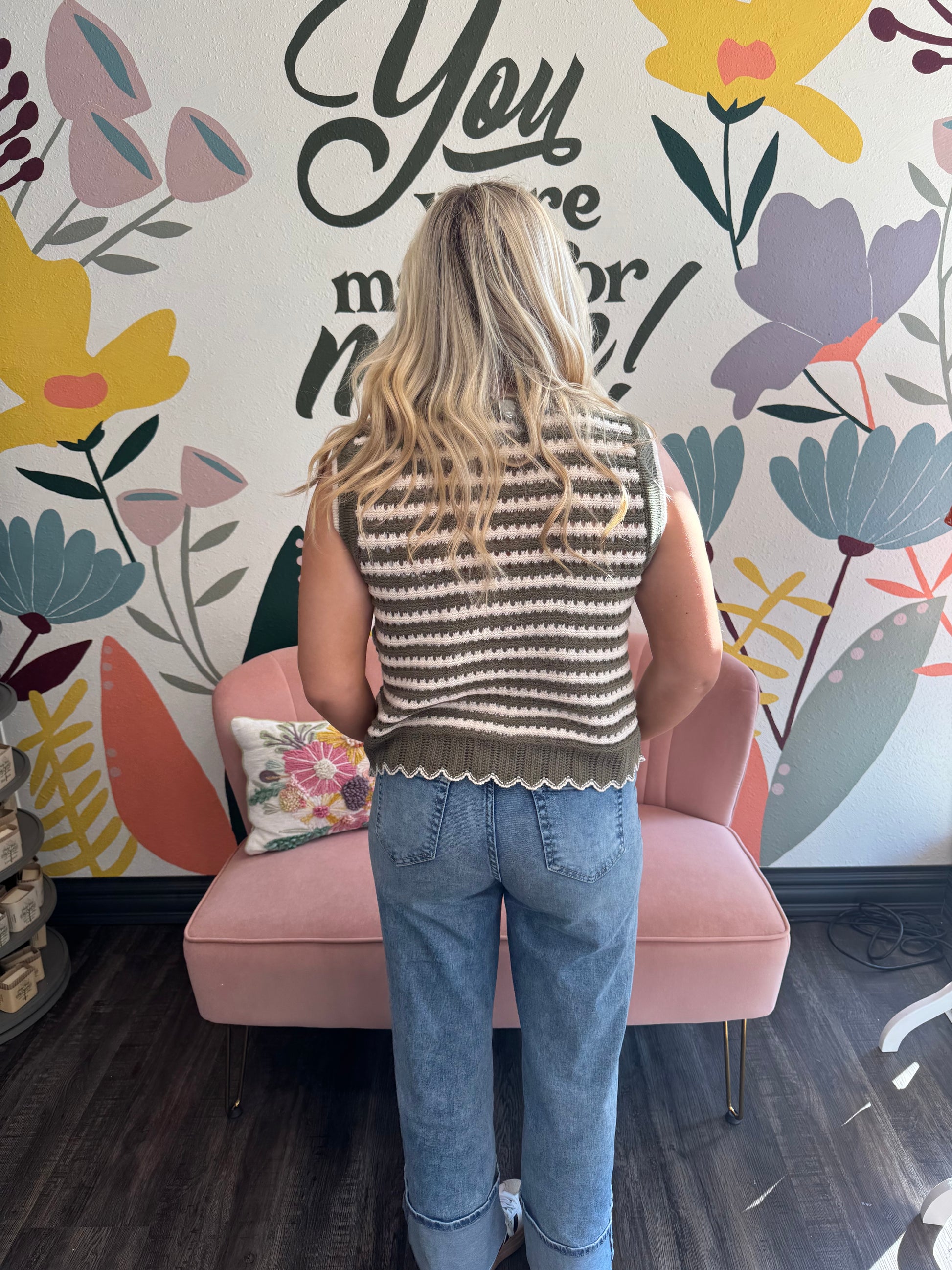 Effortless layering made cute ✨ This olive and cream striped knit vest features soft pink accents, button-front detail, and a scalloped hem for a touch of charm. Lightweight and versatile, it’s perfect to wear on its own for a chic look or layered over a tee or blouse as seasons change. A boutique favorite that blends playful style with everyday comfort.