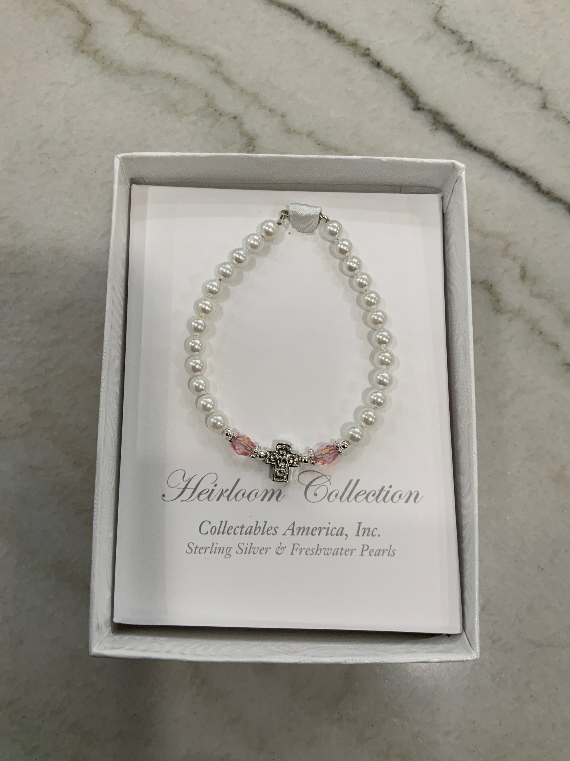 Pearl and Pink Crystals Cross Bracelet 5”