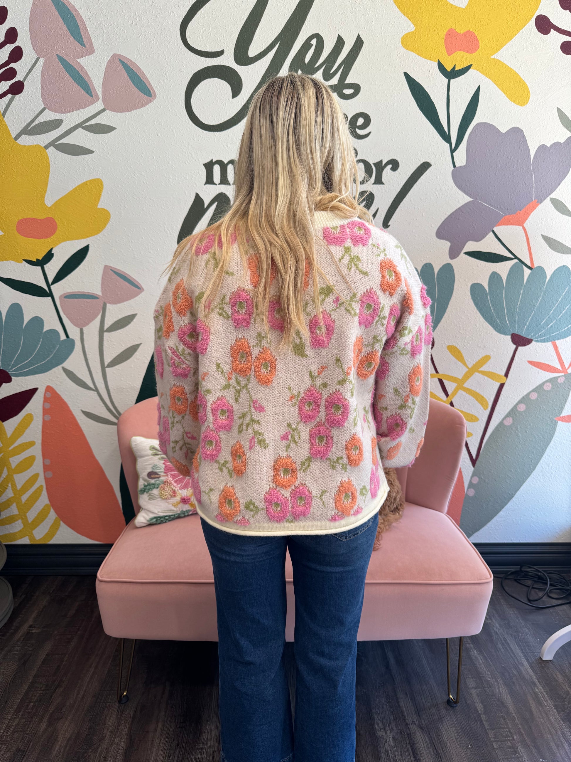 Bloom where you’re planted 🌸 This cozy knit sweater features a cream base with bold pink and orange floral designs for the perfect pop of color. With its relaxed fit, soft fabric, and playful pattern, it’s a standout piece that brings warmth and joy to your wardrobe. Pair it with denim for an easy, everyday boutique look.